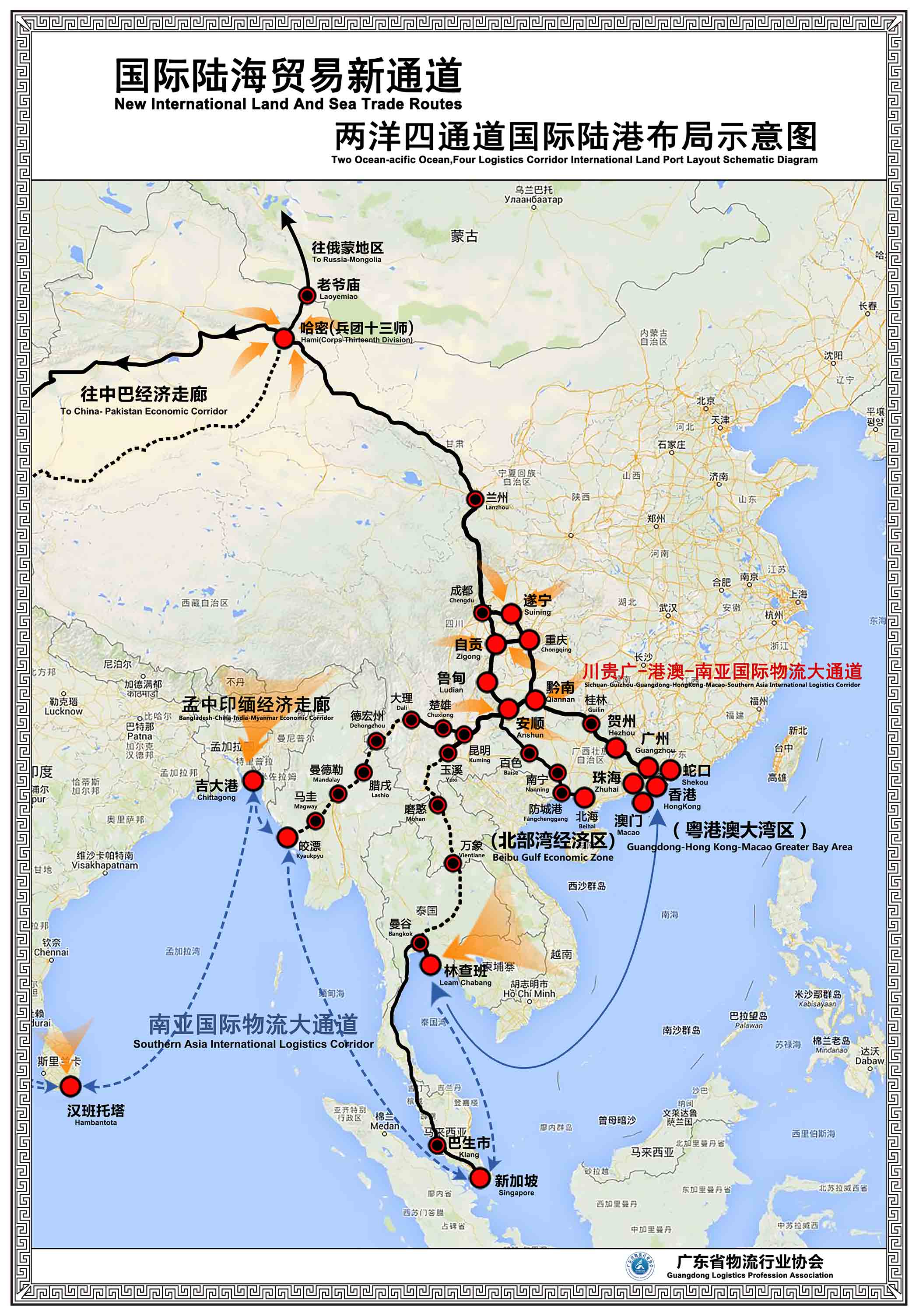 • 國(guó)際陸海貿(mào)易新通道 兩洋四通道國(guó)際陸港布局示意圖